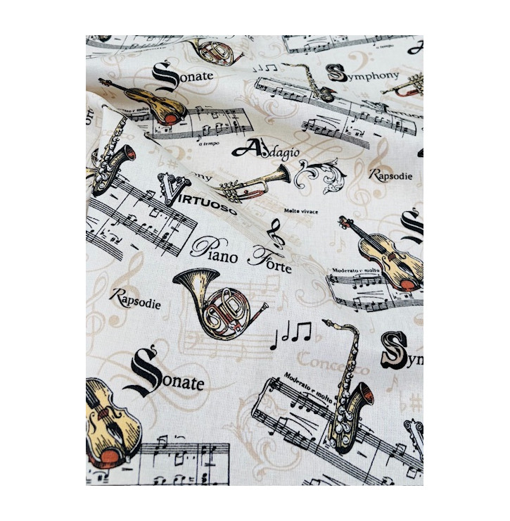 Le coupon coton enduit Virtuoso Crème séduit par son esthétique soignée et son esprit artistique. Violons, saxophones, cors, partitions et mots évocateurs de la musique classique composent un décor harmonieux, subtilement rehaussé par un fond crème doux et lumineux. Un motif élégant, idéal pour des créations à la fois décoratives et pleines de caractère.