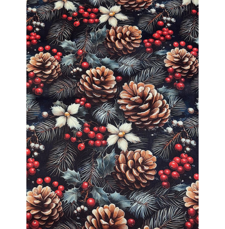 Ce tissu en sergé de coton offre une impression digitale d’une grande finesse, mettant en valeur des pommes de pin, baies rouges et feuillages d’hiver pour un motif naturel et chaleureux. Proposé en coupon de 50 x 160 cm, il est parfait pour réaliser des accessoires, décorations de Noël, chemins de table, lingettes, pochettes ou tout projet créatif nécessitant un tissu solide, durable et élégant.