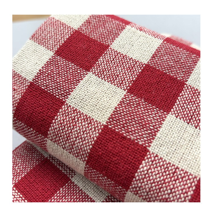 Craquez pour ce coupon de tissu coton tissé teint à carreaux beige et rouge, au style intemporel.