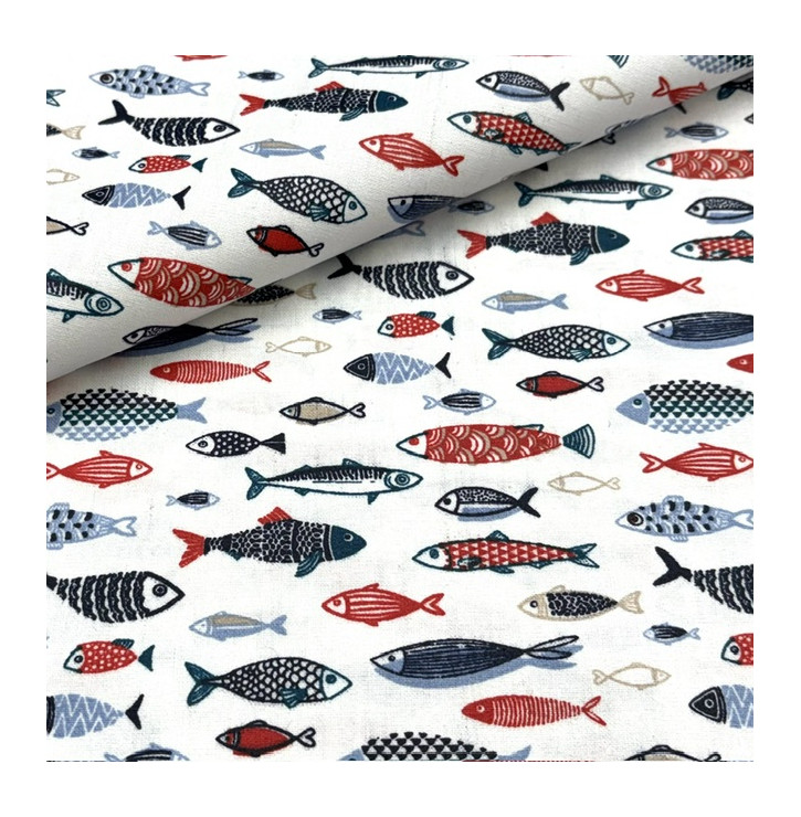 Le coton enduit Poissons blanc & lin est un tissu imperméable décoratif au motif marin coloré et ludique. Souple grâce à son enduction légère, il est idéal pour des créations pratiques et originales. Disponible en coupon 50x70 cm et 50x160 cm.