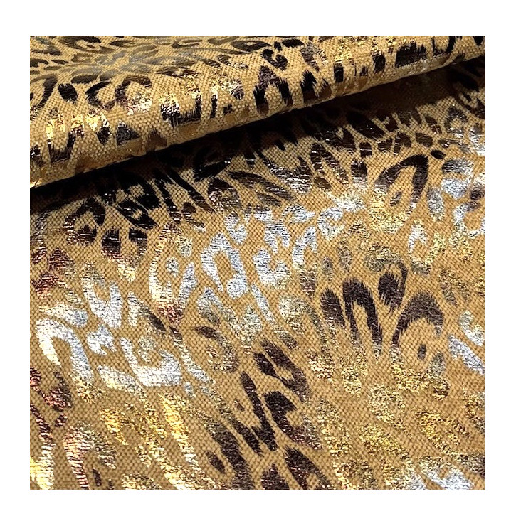 Son coloris fauve, entre camel et brun chaud, apporte immédiatement une sensation de chaleur et d’élégance. Il est sublimé par un motif graphique abstrait enrichi de reflets dorés brillants, qui accrochent la lumière et donnent au tissu un rendu haut de gamme et vivant.