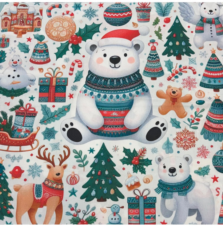 Carré coton 45x45 cm motif placé Ours Polaire Pull Jacquard sur fond Blanc Neige : impression digitale HD, idéal coussins, déco festive et créations hivernales.