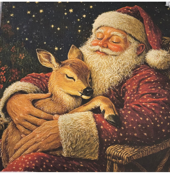 Découvrez le carré coton "Père Noël & Faon Endormi" (45 x 45 cm – 100% coton), un motif placé d’une grande tendresse illustrant un Père Noël assoupi, tenant doucement un jeune faon contre lui.