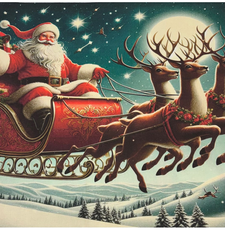 Découvrez le carré coton "Traîneau du Père Noël" (45 x 45 cm – 100% coton), une illustration spectaculaire mettant en scène le Père Noël volant au-dessus d’un paysage enneigé à bord de son traîneau rouge orné de dorures.