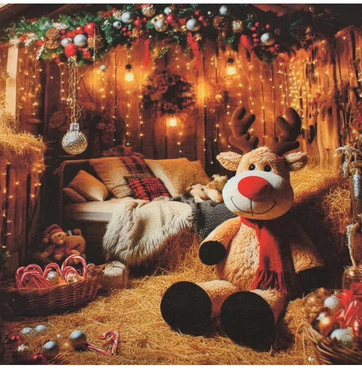 Découvrez le carré coton "Renne Peluche au Chalet" (45 x 45 cm – 100% coton), un motif placé adorable représentant un grand renne peluche assis dans une étable décorée pour Noël.