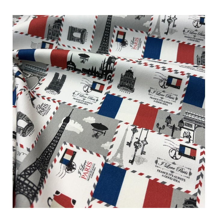 Ce sergé de coton naturel offre une belle tenue grâce à son tissage diagonal tout en restant souple et agréable à coudre Sur un fond blanc lumineux les illustrations parisiennes Tour Eiffel monuments cartes postales et détails graphiques créent un univers chic et harmonieux