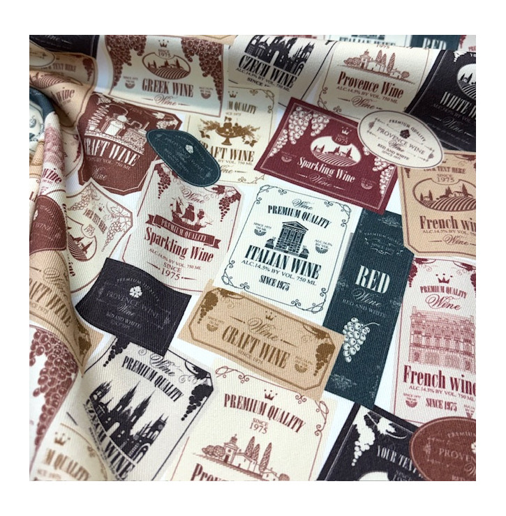 Ce sergé de coton naturel séduit par la qualité de son tissage diagonal offrant une excellente tenue tout en conservant une belle souplesse à la couture Le fond blanc met en valeur une composition d’étiquettes de vin aux inspirations vintage et premium créant un visuel riche harmonieux et immédiatement valorisant