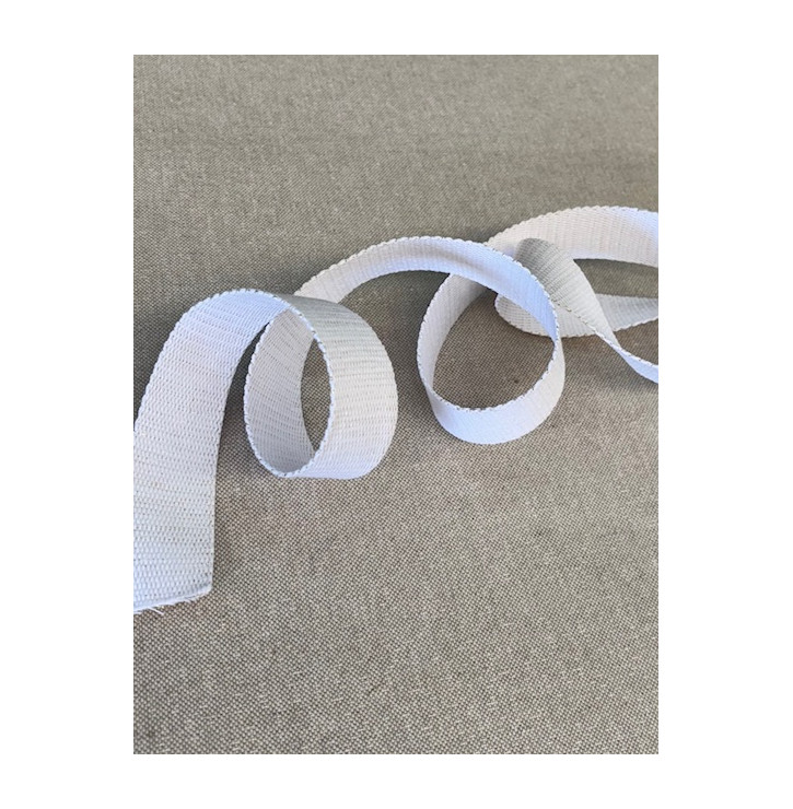 Sangle coton 30 mm blanche 98% coton / 2% métalloplastique : lumineuse, chic et résistante. Parfaite pour anses de sacs, pochettes et accessoires DIY. Vendue au mètre.