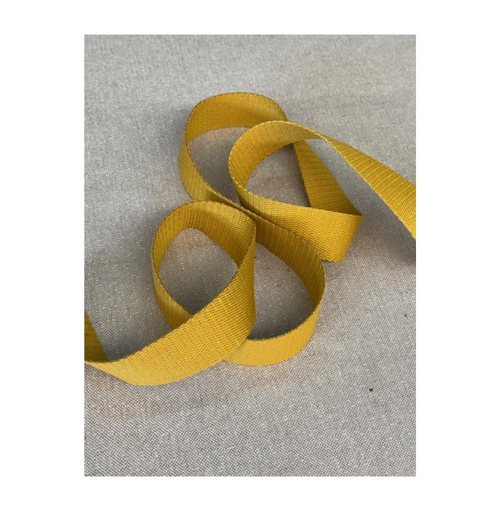 Sangle coton 30 mm moutarde 98% coton / 2% métalloplastique : chaleureuse, tendance et légèrement scintillante. Idéale pour anses de sacs et accessoires DIY. Vendue au mètre.