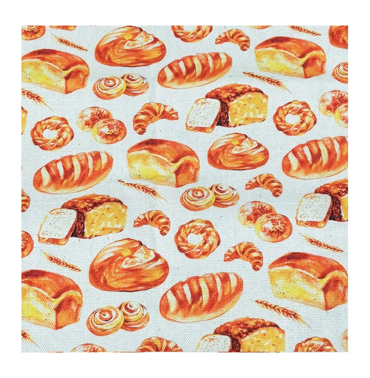 Coupon de tissu aspect lin motif Boulangerie, illustré de pains et viennoiseries aux tons dorés et bruns sur fond écru. En 100 % coton, il offre un toucher naturel, souple et agréable, avec le rendu élégant du lin. Idéal pour la confection d’accessoires cuisine et déco : torchons, sets de table, sacs, panières, coussins et projets DIY.