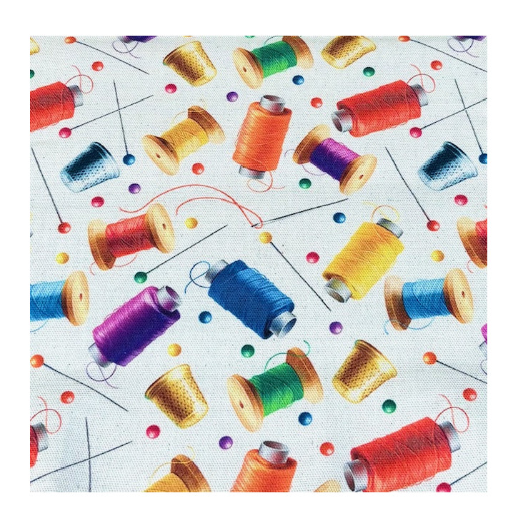 Coupon de tissu aspect lin motif Bobines & Mercerie multicolore, inspiré de l’univers de la couture et du DIY. Bobines de fil, aiguilles et épingles colorées s’animent sur fond écru pour un rendu créatif, joyeux et graphique. Sa composition 100 % coton offre un toucher naturel, souple et agréable, tout en conservant l’esthétique du lin. Idéal pour la confection de trousses, pochettes, sacs, panières, coussins, accessoires couture ou éléments déco pour un atelier créatif.