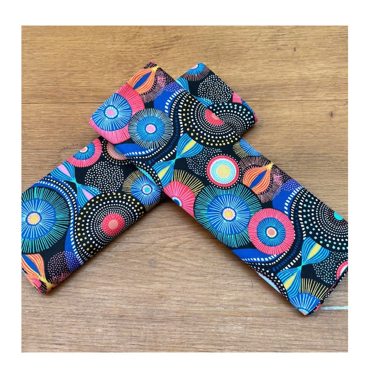 Le coton imprimé Boubi Bleu Rose est un véritable allié pour des créations qui sortent du lot. Son motif graphique composé de cercles colorés apporte du rythme et du contraste, tout en restant facile à associer grâce à son fond sombre.