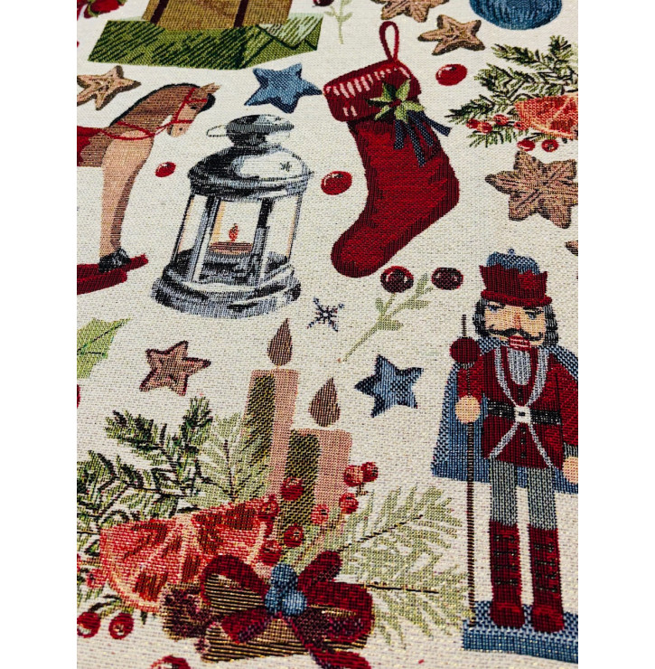 Coupon jacquard lurex 50x140 cm motif Casse-Noisette, décorations de Noël traditionnelles sur fond beige avec touches scintillantes. Parfait pour la déco.