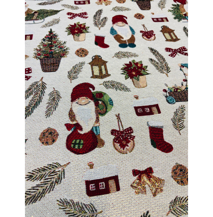 Coupon jacquard lurex 50x140 cm motif gnomes nordiques, lanternes, sapins et décorations rouges sur fond beige scintillant. Idéal pour une déco chaleureuse.